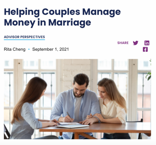 Meet with a Financial Professional Regularly: Whether you’re speaking to existing planning clients, prospects, investment management clients, or anybody else, it’s in a couple’s best interest to meet with a financial professional, as their budget allows, to keep their finances on track. When meeting with couples, it’s important to know the role money plays in their marriage.