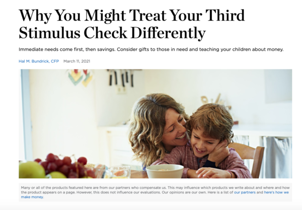 March 11, 2021 — The article published today by Hal Bundrick, CFP®’s in NerdWallet explains, “Immediate needs come first, then savings. Consider gifts to those in need and teaching your children about money.”